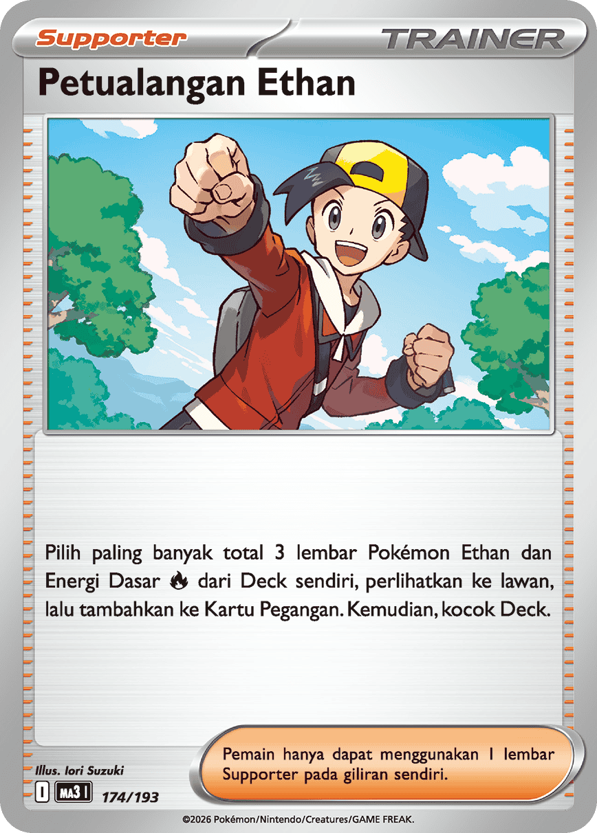 Pilih paling banyak total 3 lembar Pokémon Ethan dan Energi Dasar {Api} dari Deck sendiri, perlihatkan ke lawan, lalu tambahkan ke Kartu Pegangan. Kemudian, kocok Deck.