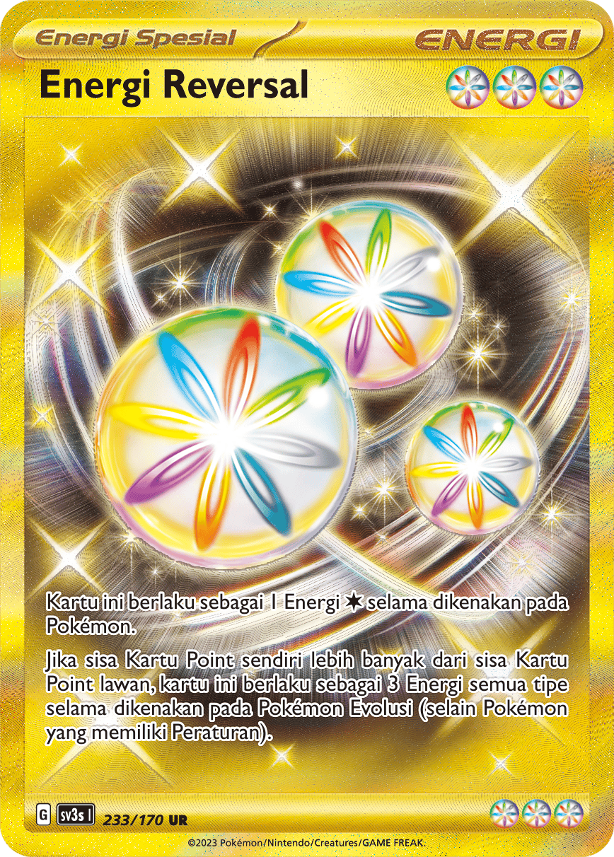 Kartu ini berlaku sebagai 1 Energi {Bening} selama dikenakan pada Pokémon. Jika sisa Kartu Point sendiri lebih banyak dari sisa Kartu Point lawan, kartu ini berlaku sebagai 3 Energi semua tipe selama dikenakan pada Pokémon Evolusi (selain Pokémon yang memiliki Peraturan).
