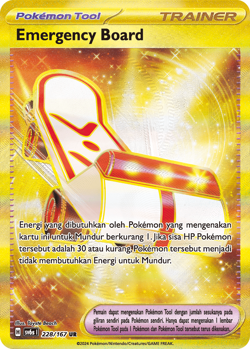 Energi yang dibutuhkan oleh Pokémon yang mengenakan kartu ini untuk Mundur berkurang 1. Jika sisa HP Pokémon tersebut adalah 30 atau kurang, Pokémon tersebut menjadi tidak membutuhkan Energi untuk Mundur.
