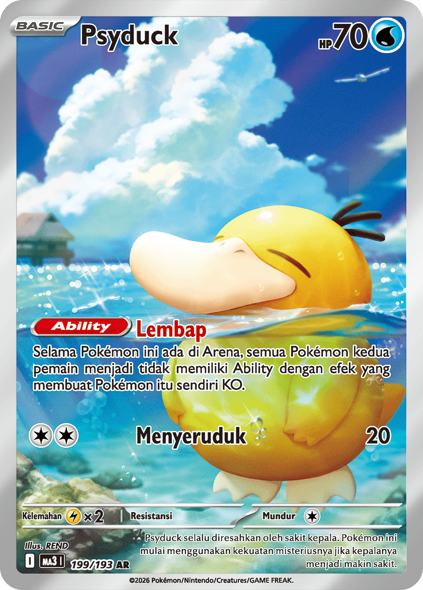 Psyduck selalu diresahkan oleh sakit kepala. Pokémon ini mulai menggunakan kekuatan misteriusnya jika kepalanya menjadi makin sakit.