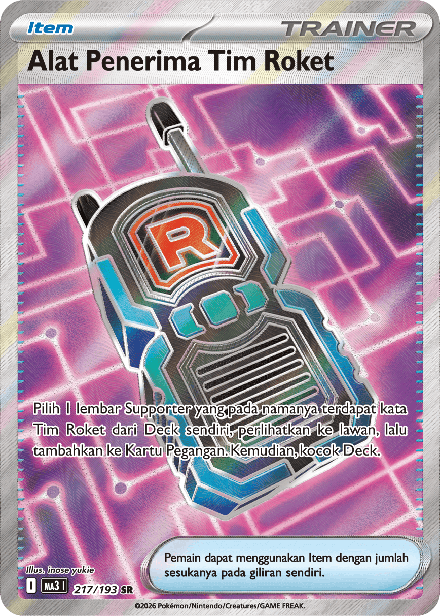 Pilih 1 lembar Supporter yang pada namanya terdapat kata Tim Roket dari Deck sendiri, perlihatkan ke lawan, lalu tambahkan ke Kartu Pegangan. Kemudian, kocok Deck.