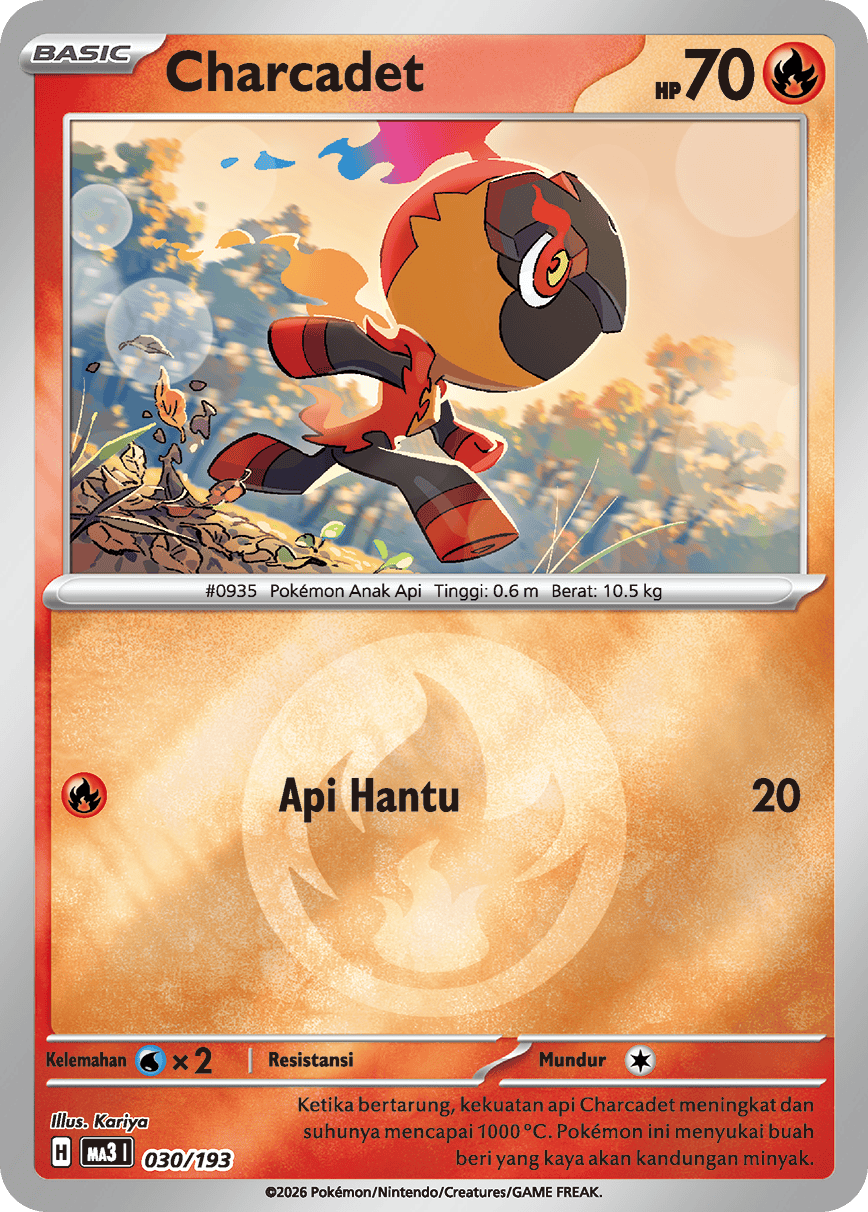 Ketika bertarung, kekuatan api Charcadet meningkat dan suhunya mencapai 1000 ℃. Pokémon ini menyukai buah beri yang kaya akan kandungan minyak.
