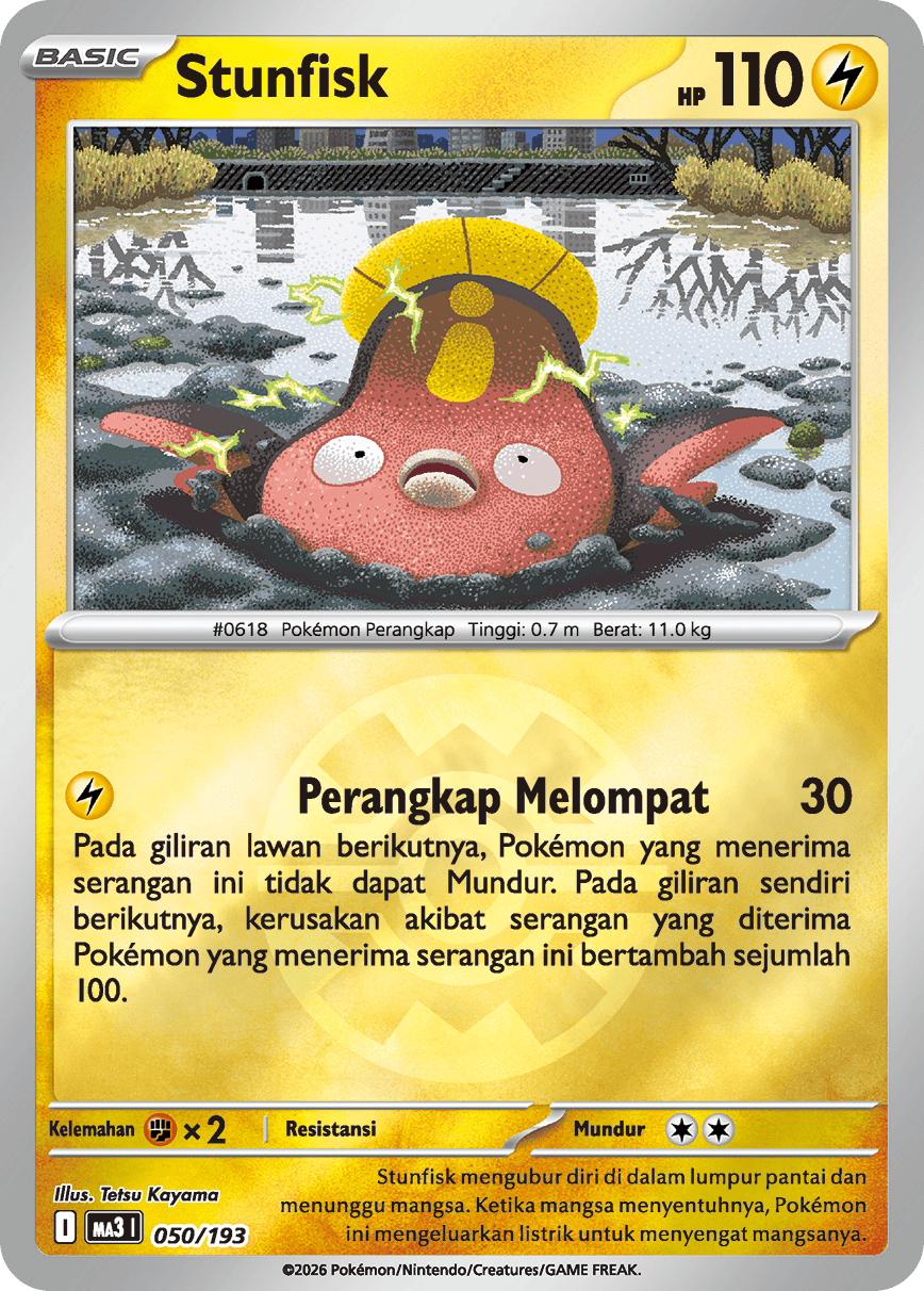 Stunfisk mengubur diri di dalam lumpur pantai dan menunggu mangsa. Ketika mangsa menyentuhnya, Pokémon ini mengeluarkan listrik untuk menyengat mangsanya.