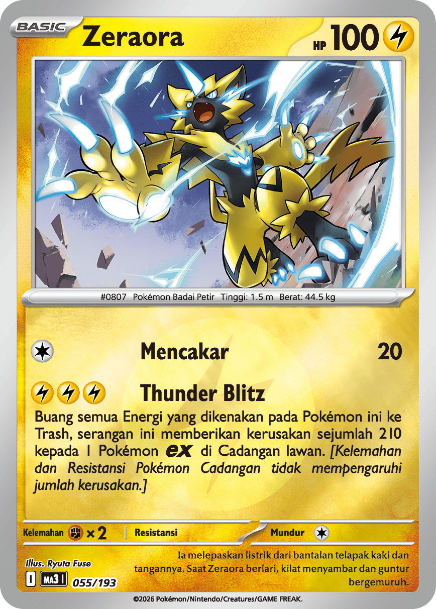 Ia melepaskan listrik dari bantalan telapak kaki dan tangannya. Saat Zeraora berlari, kilat menyambar dan guntur bergemuruh.