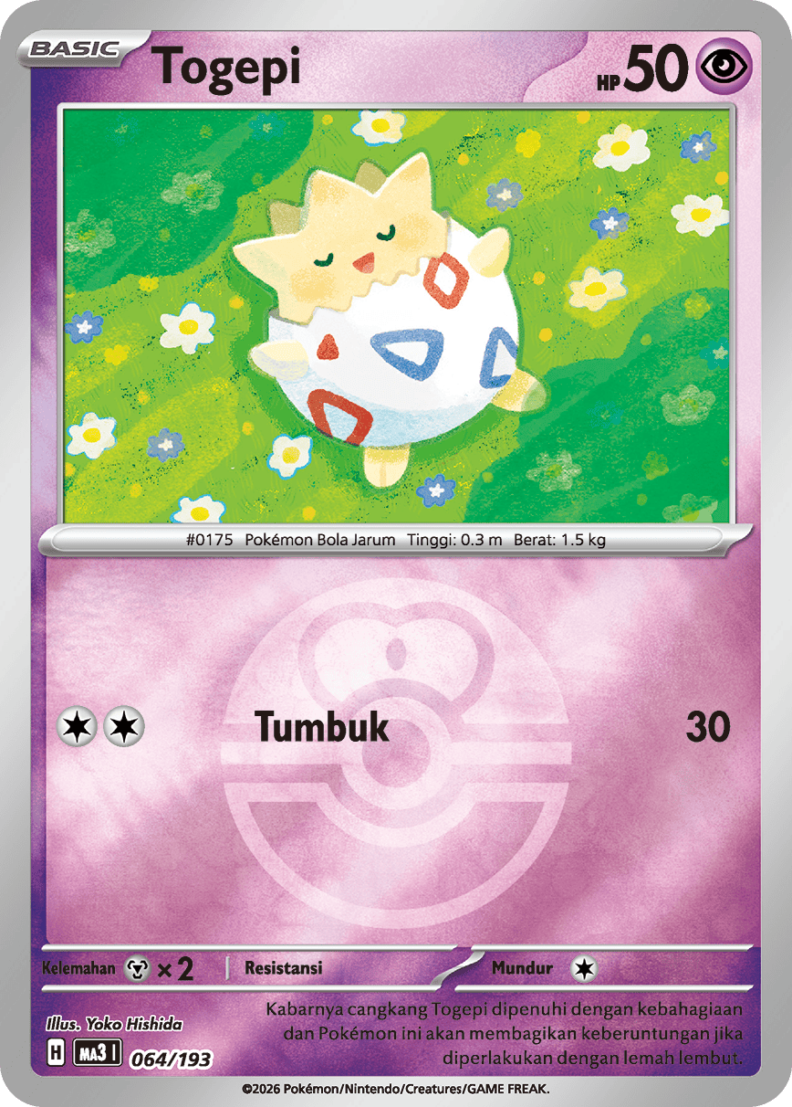 Kabarnya cangkang Togepi dipenuhi dengan kebahagiaan dan Pokémon ini akan membagikan keberuntungan jika diperlakukan dengan lemah lembut.