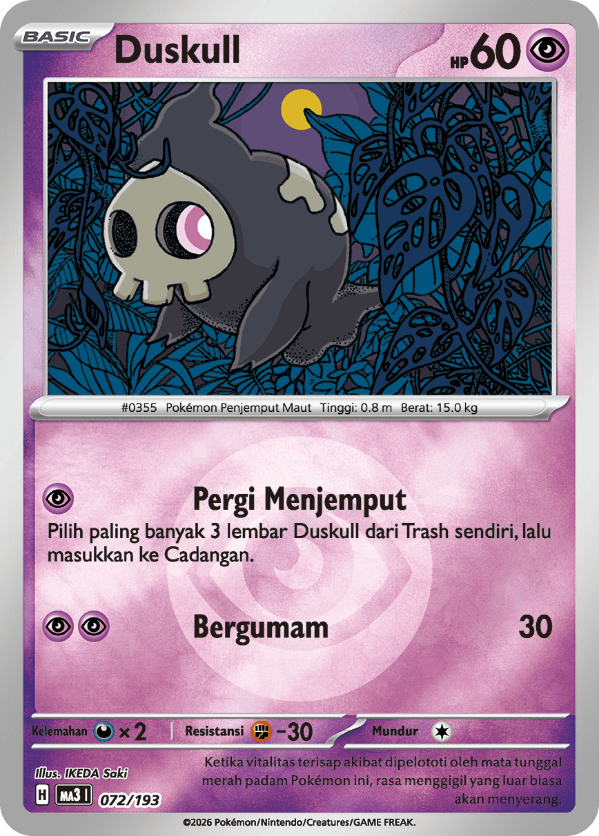 Pilih paling banyak 3 lembar Duskull dari Trash sendiri, lalu masukkan ke Cadangan.