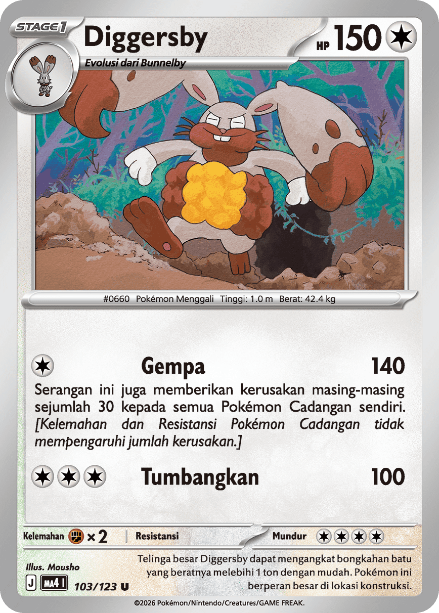 Telinga besar Diggersby dapat mengangkat bongkahan batu yang beratnya melebihi 1 ton dengan mudah. Pokémon ini berperan besar di lokasi konstruksi.