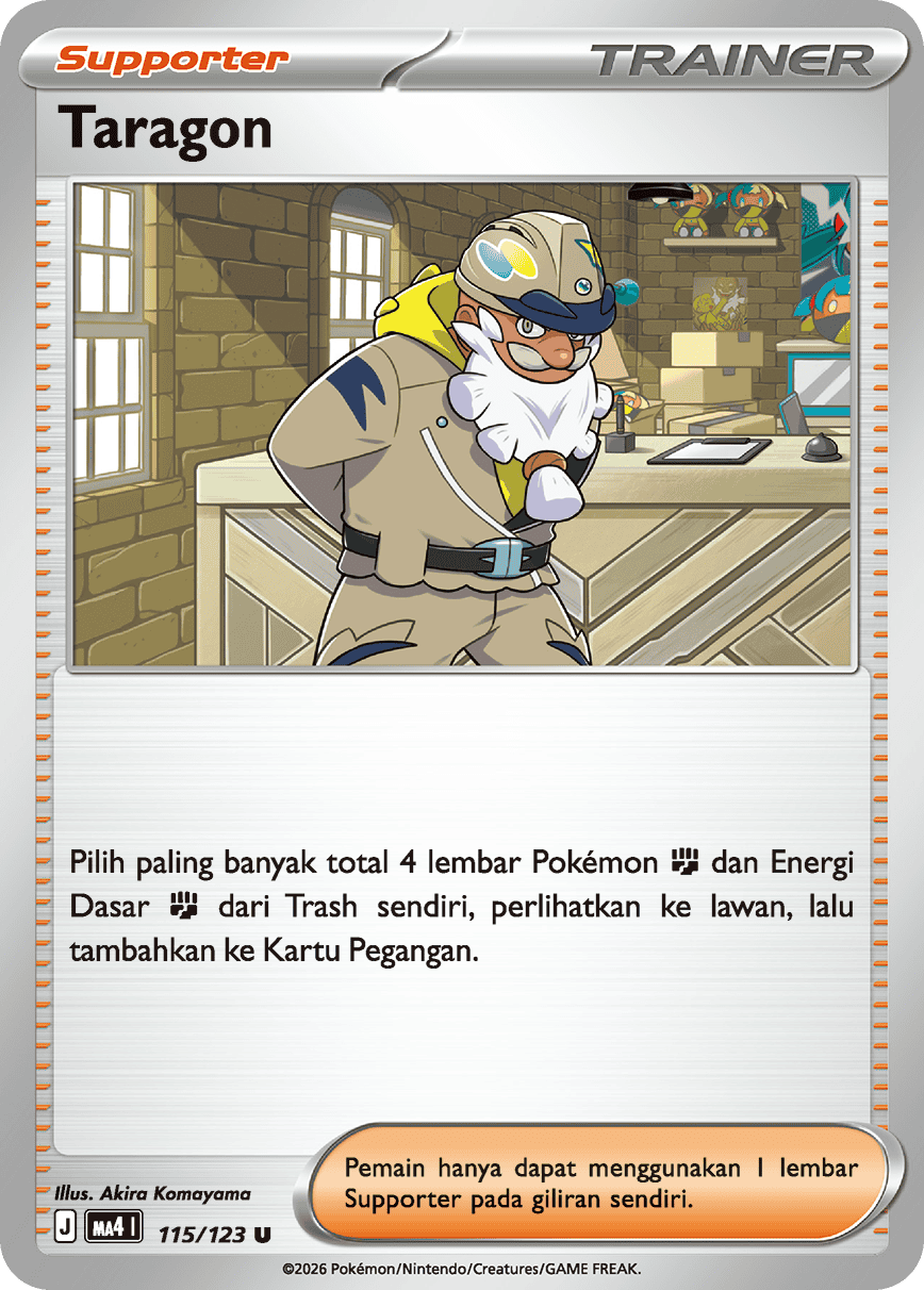 Pilih paling banyak total 4 lembar Pokémon {Petarung} dan Energi Dasar {Petarung} dari Trash sendiri, perlihatkan ke lawan, lalu tambahkan ke Kartu Pegangan.