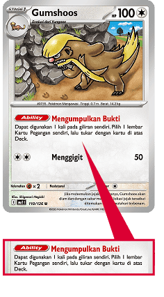 Ada Pokémon yang tidak hanya memiliki serangan, tapi juga memiliki Ability. Ability dapat digunakan bila Pokémon yang memiliki Ability tersebut berada di Arena. Beri tahu lawan saat akan menggunakan Ability, lalu lakukan hal yang tertulis di kalimat penjelasan.