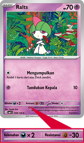 Contohnya, Ralts memiliki Kelemahan tipe Kegelapan dan Resistansi tipe Petarung.
