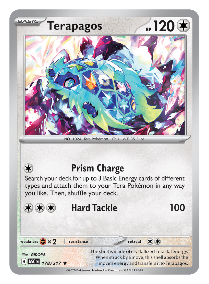 Search your deck for up to 3 Basic Energy cards of different types and attach them to your Tera Pokémon in any way you like. Then, shuffle your deck.