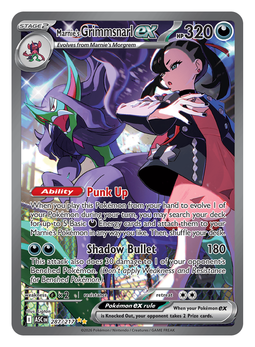 When you play this Pokémon from your hand to evolve 1 of your Pokémon during your turn, you may search your deck for up to 5 Basic {D} Energy cards and attach them to your Marnie’s Pokémon in any way you like. Then, shuffle your deck.