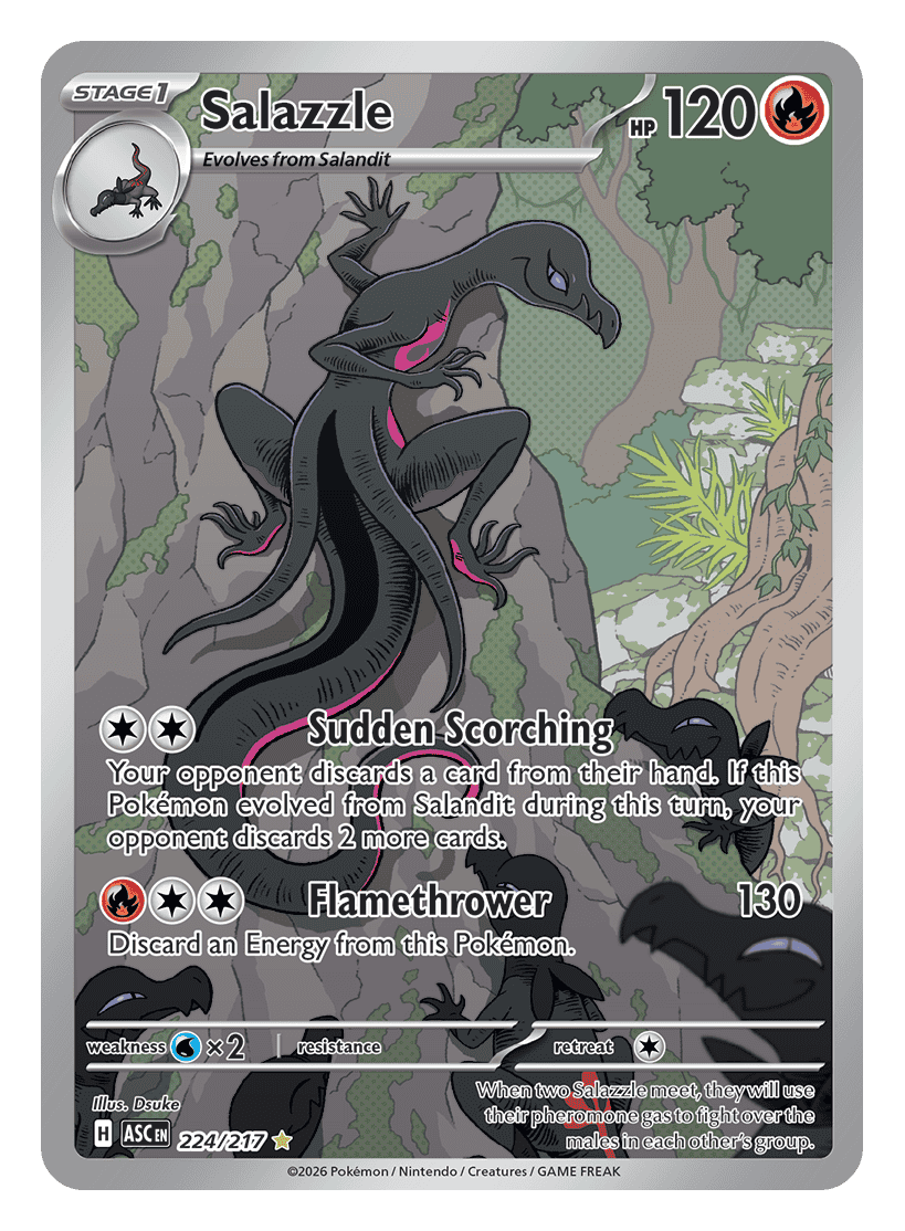 Your opponent discards a card from their hand. If this Pokémon evolved from Salandit during this turn, your opponent discards 2 more cards.