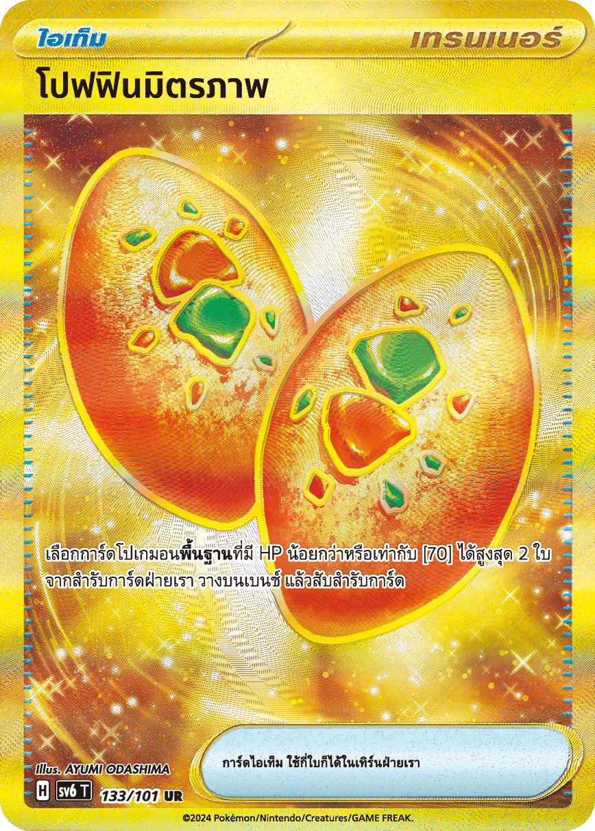 เลือกการ์ดโปเกมอน[พื้นฐาน]ที่มี HP น้อยกว่าหรือเท่ากับ [70] ได้สูงสุด 2 ใบ จากสำรับการ์ดฝ่ายเรา วางบนเบนช์ แล้วสับสำรับการ์ด