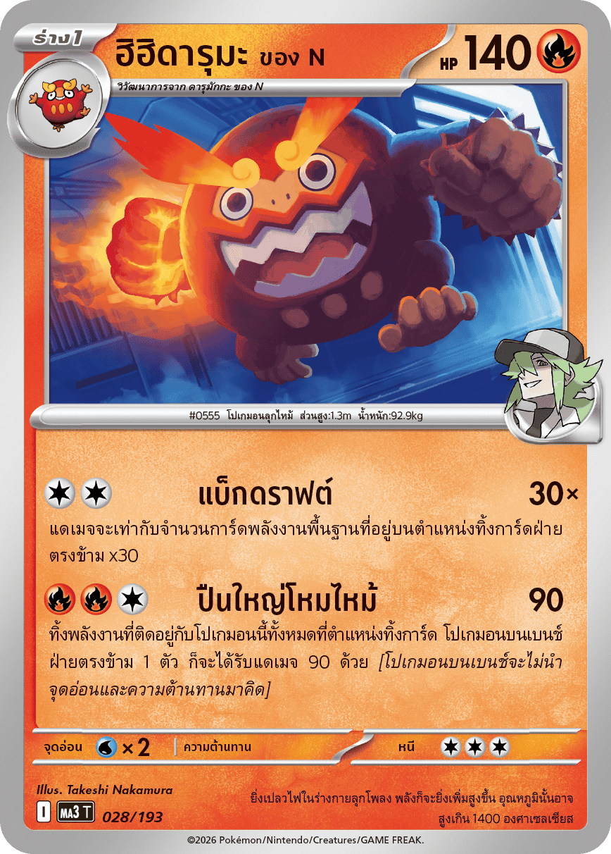 ทิ้งพลังงานที่ติดอยู่กับโปเกมอนนี้ทั้งหมดที่ตำแหน่งทิ้งการ์ด โปเกมอนบนเบนช์ ฝ่ายตรงข้าม 1 ตัว ก็จะได้รับแดเมจ 90 ด้วย {โปเกมอนบนเบนช์จะไม่นำ จุดอ่อนและความต้านทานมาคิด}