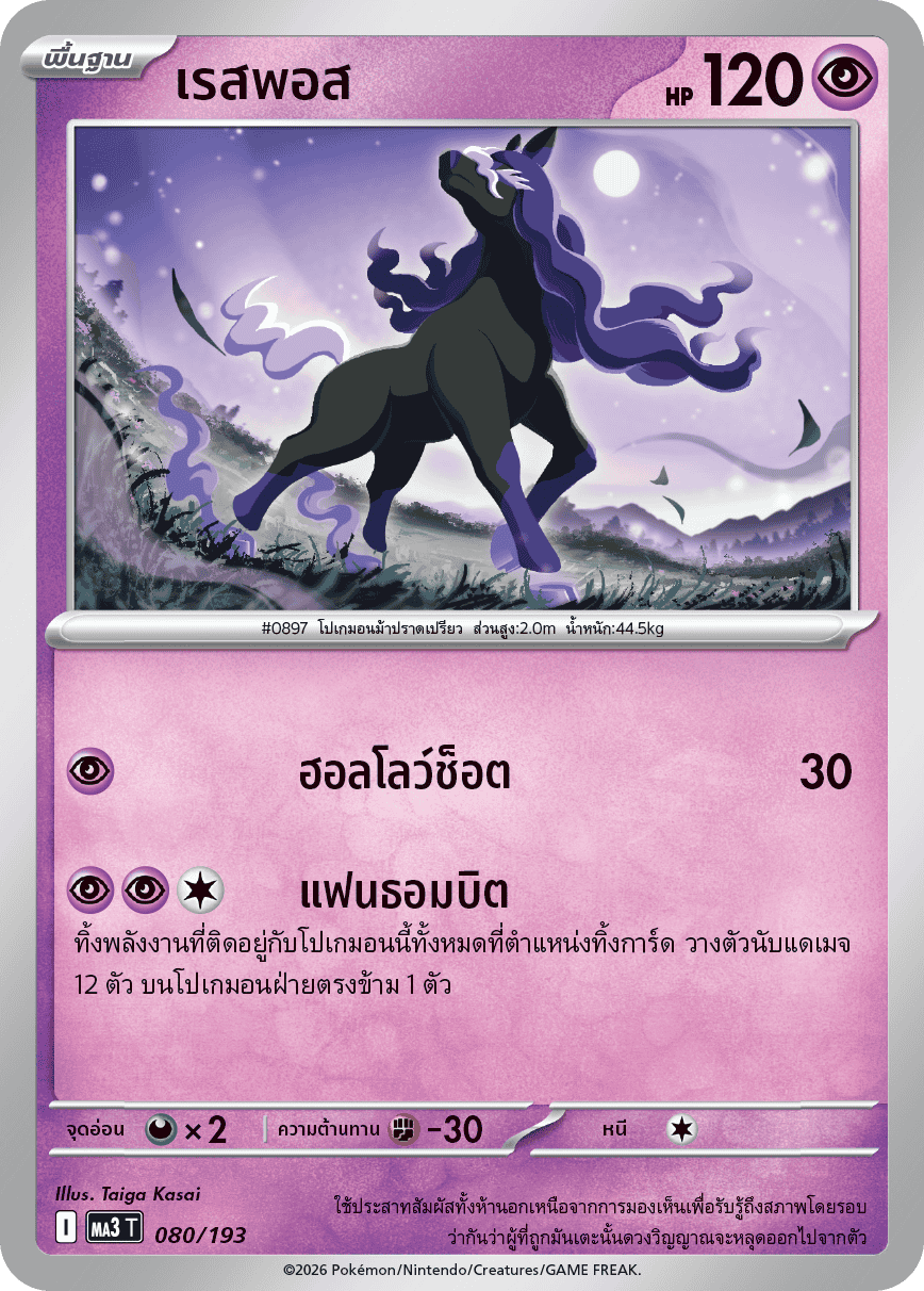ทิ้งพลังงานที่ติดอยู่กับโปเกมอนนี้ทั้งหมดที่ตำแหน่งทิ้งการ์ด วางตัวนับแดเมจ 12 ตัว บนโปเกมอนฝ่ายตรงข้าม 1 ตัว