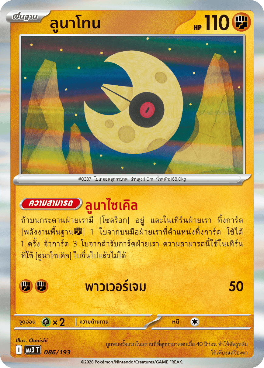 ถ้าบนกระดานฝ่ายเรามี [โซลร็อก] อยู่ และในเทิร์นฝ่ายเรา ทิ้งการ์ด [พลังงานพื้นฐาน[ต่อสู้]] 1 ใบจากบนมือฝ่ายเราที่ตำแหน่งทิ้งการ์ด ใช้ได้ 1 ครั้ง จั่วการ์ด 3 ใบจากสำรับการ์ดฝ่ายเรา ความสามารถนี้ใช้ในเทิร์น ที่ใช้ [ลูนาไซเคิล] ใบอื่นไปแล้วไม่ได้