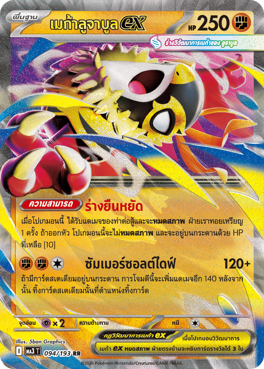 ถ้ามีการ์ดสเตเดียมอยู่บนกระดาน การโจมตีนี้จะเพิ่มแดเมจอีก 140 หลังจาก นั้น ทิ้งการ์ดสเตเดียมนั้นที่ตำแหน่งทิ้งการ์ด