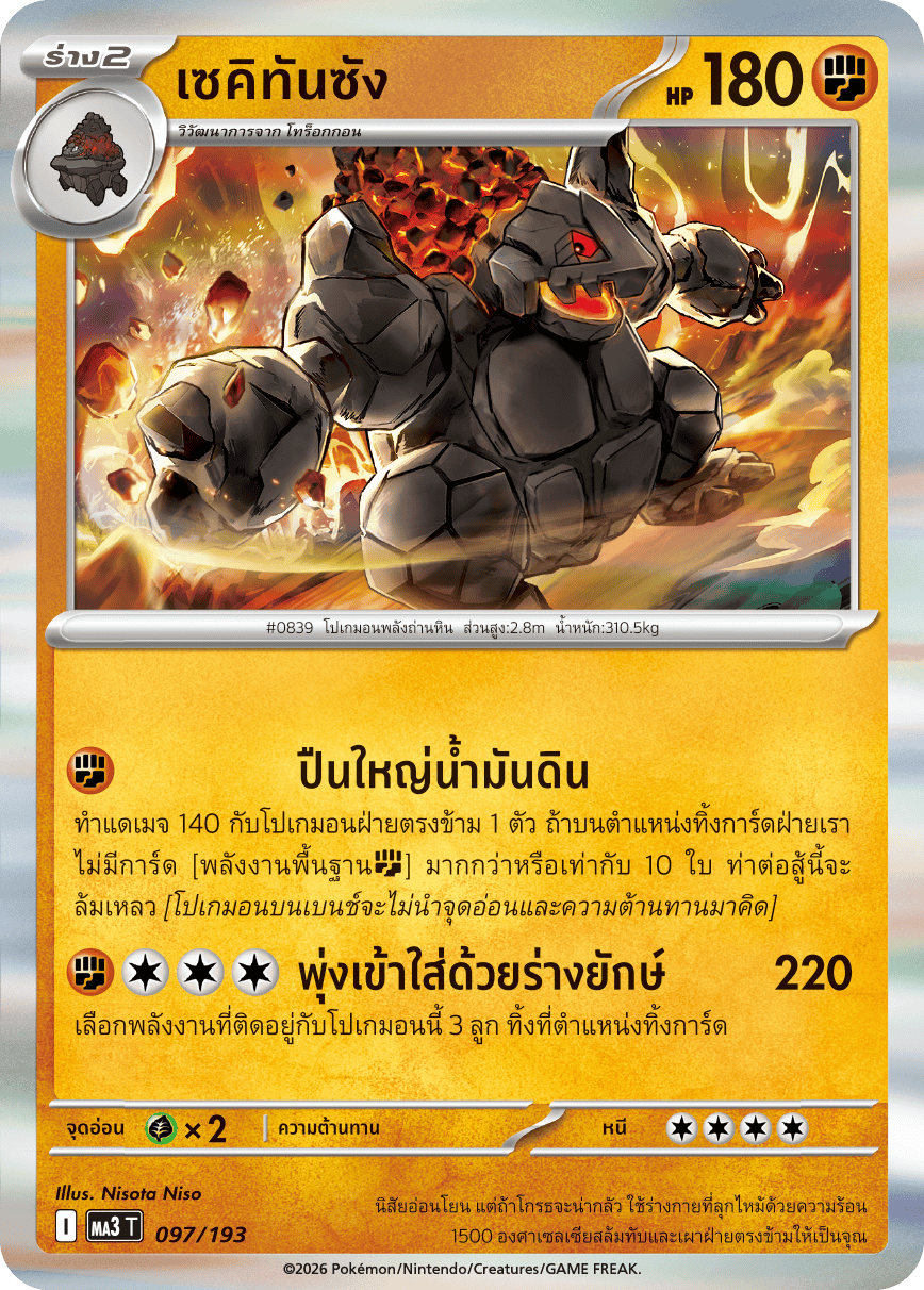 ทำแดเมจ 140 กับโปเกมอนฝ่ายตรงข้าม 1 ตัว ถ้าบนตำแหน่งทิ้งการ์ดฝ่ายเรา ไม่มีการ์ด [พลังงานพื้นฐาน[ต่อสู้]] มากกว่าหรือเท่ากับ 10 ใบ ท่าต่อสู้นี้จะ ล้มเหลว {โปเกมอนบนเบนช์จะไม่นำจุดอ่อนและความต้านทานมาคิด}