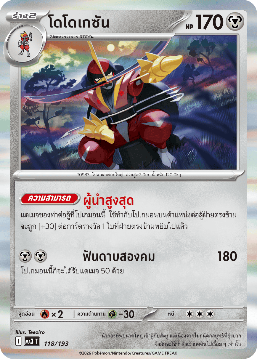 แดเมจของท่าต่อสู้ที่โปเกมอนนี้ ใช้ทำกับโปเกมอนบนตำแหน่งต่อสู้ฝ่ายตรงข้าม จะถูก [+30] ต่อการ์ดรางวัล 1 ใบที่ฝ่ายตรงข้ามหยิบไปแล้ว
