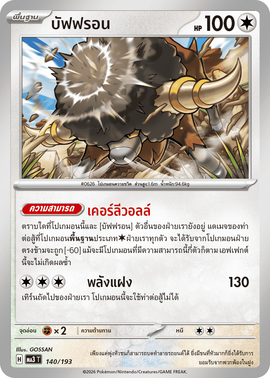 ตราบใดที่โปเกมอนนี้และ [บัฟฟรอน] ตัวอื่นของฝ่ายเรายังอยู่ แดเมจของท่า ต่อสู้ที่โปเกมอน[พื้นฐาน]ประเภท[ไร้สี]ฝ่ายเราทุกตัว จะได้รับจากโปเกมอนฝ่าย ตรงข้ามจะถูก [-60] แม้จะมีโปเกมอนที่มีความสามารถนี้กี่ตัวก็ตาม เอฟเฟกต์ นี้จะไม่เกิดผลซ้ำ
