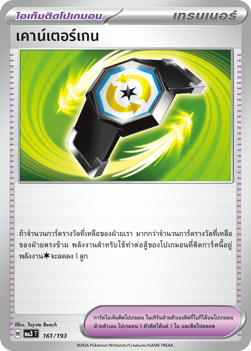 ถ้าจำนวนการ์ดรางวัลที่เหลือของฝ่ายเรา มากกว่าจำนวนการ์ดรางวัลที่เหลือ ของฝ่ายตรงข้าม พลังงานสำหรับใช้ท่าต่อสู้ของโปเกมอนที่ติดการ์ดนี้อยู่ พลังงาน[ไร้สี]จะลดลง 1 ลูก