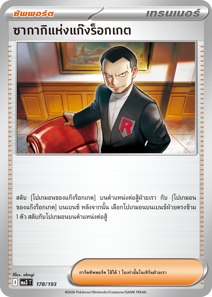 สลับ [โปเกมอนของแก๊งร็อกเกต] บนตำแหน่งต่อสู้ฝ่ายเรา กับ [โปเกมอน ของแก๊งร็อกเกต] บนเบนช์ หลังจากนั้น เลือกโปเกมอนบนเบนช์ฝ่ายตรงข้าม 1 ตัว สลับกับโปเกมอนบนตำแหน่งต่อสู้