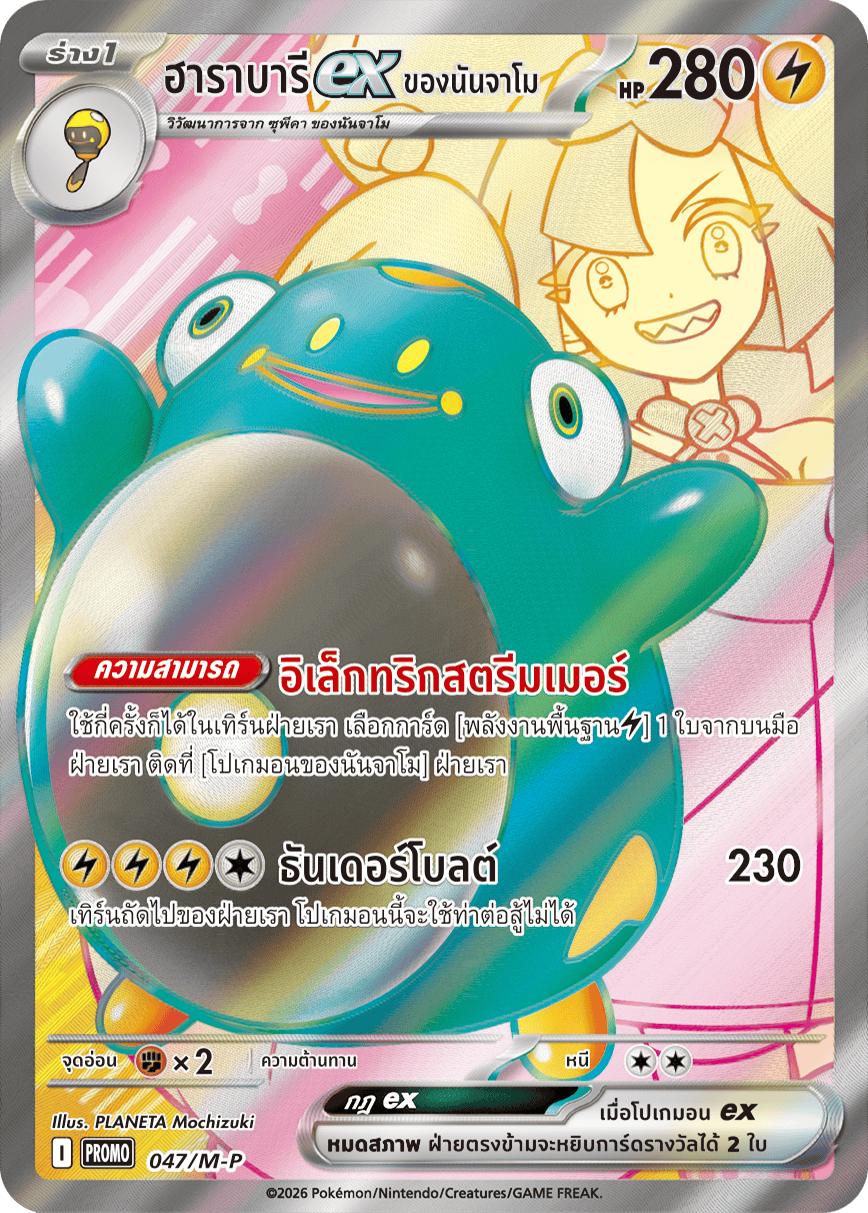 ใช้กี่ครั้งก็ได้ในเทิร์นฝ่ายเรา เลือกการ์ด [พลังงานพื้นฐาน[สายฟ้า]] 1 ใบจากบนมือ ฝ่ายเรา ติดที่ [โปเกมอนของนันจาโม] ฝ่ายเรา