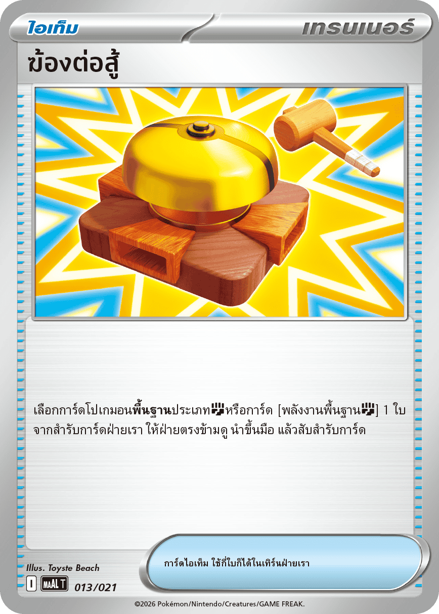 เลือกการ์ดโปเกมอน[พื้นฐาน]ประเภท[ต่อสู้]หรือการ์ด [พลังงานพื้นฐาน[ต่อสู้]] 1 ใบ จากสำรับการ์ดฝ่ายเรา ให้ฝ่ายตรงข้ามดู นำขึ้นมือ แล้วสับสำรับการ์ด