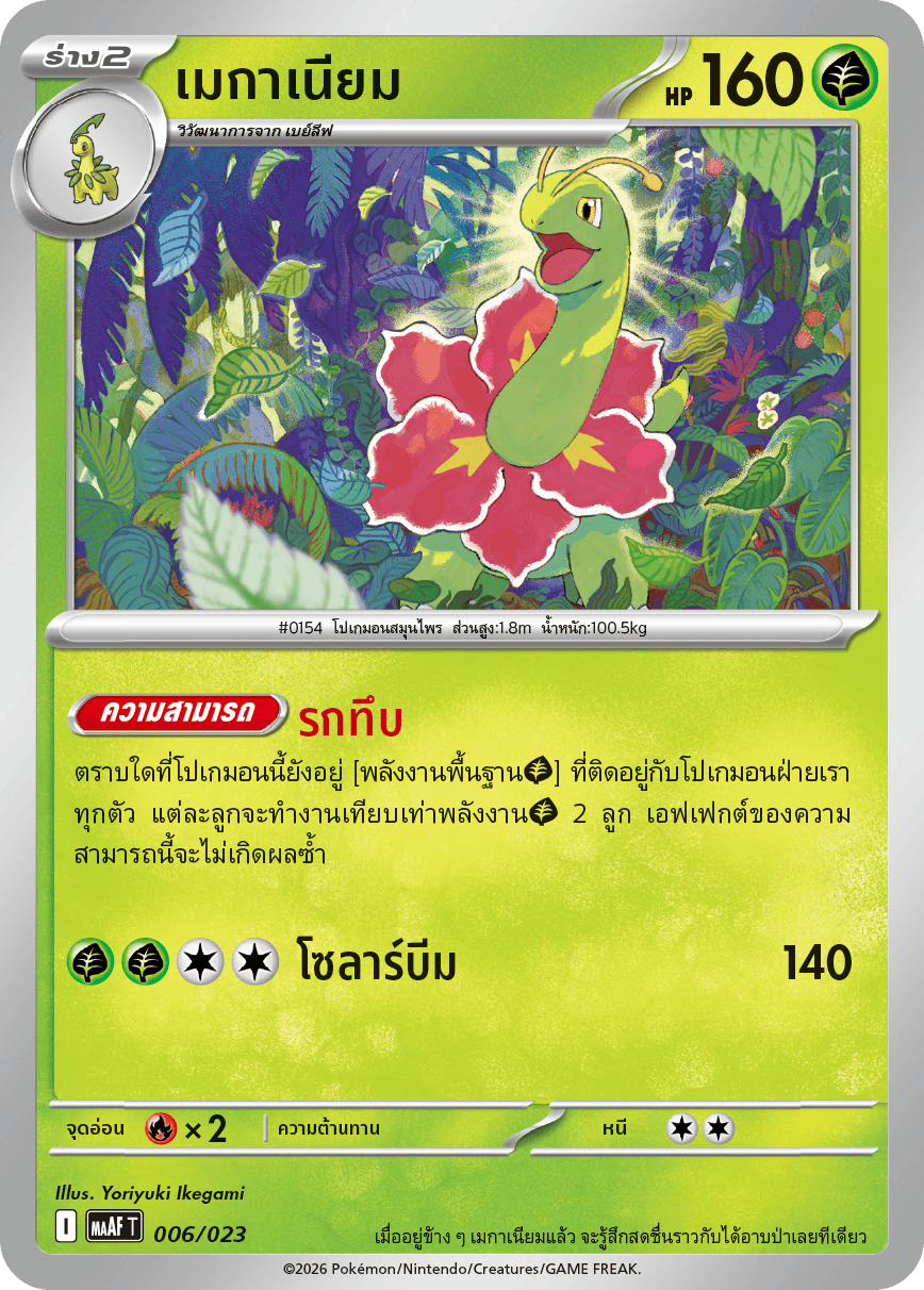 ตราบใดที่โปเกมอนนี้ยังอยู่ [พลังงานพื้นฐาน[หญ้า]] ที่ติดอยู่กับโปเกมอนฝ่ายเรา ทุกตัว แต่ละลูกจะทำงานเทียบเท่าพลังงาน[หญ้า] 2 ลูก เอฟเฟกต์ของความ สามารถนี้จะไม่เกิดผลซ้ำ