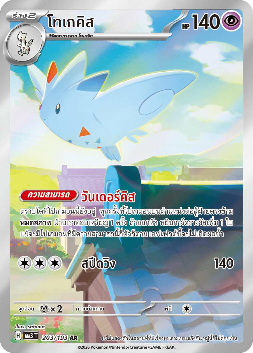ตราบใดที่โปเกมอนนี้ยังอยู่ ทุกครั้งที่โปเกมอนบนตำแหน่งต่อสู้ฝ่ายตรงข้าม [หมดสภาพ] ฝ่ายเราทอยเหรียญ 1 ครั้ง ถ้าออกหัว หยิบการ์ดรางวัลเพิ่ม 1 ใบ แม้จะมีโปเกมอนที่มีความสามารถนี้กี่ตัวก็ตาม เอฟเฟกต์นี้จะไม่เกิดผลซ้ำ