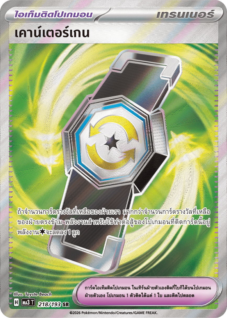 ถ้าจำนวนการ์ดรางวัลที่เหลือของฝ่ายเรา มากกว่าจำนวนการ์ดรางวัลที่เหลือ ของฝ่ายตรงข้าม พลังงานสำหรับใช้ท่าต่อสู้ของโปเกมอนที่ติดการ์ดนี้อยู่ พลังงาน[ไร้สี]จะลดลง 1 ลูก