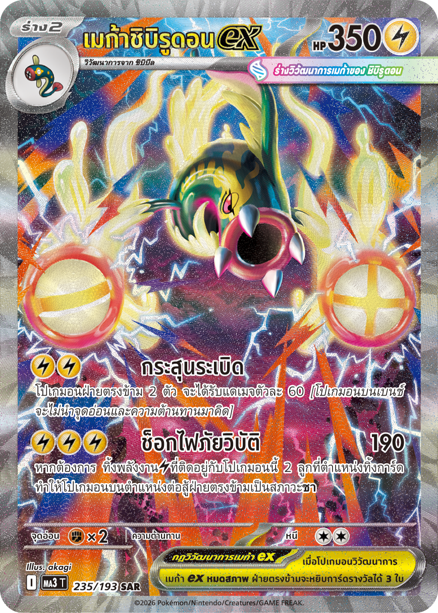หากต้องการ ทิ้งพลังงาน[สายฟ้า]ที่ติดอยู่กับโปเกมอนนี้ 2 ลูกที่ตำแหน่งทิ้งการ์ด ทำให้โปเกมอนบนตำแหน่งต่อสู้ฝ่ายตรงข้ามเป็นสภาวะ[ชา]