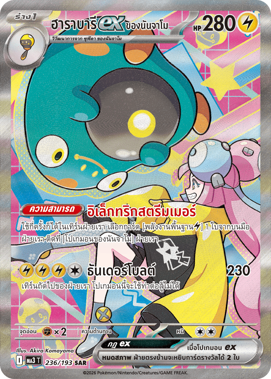 ใช้กี่ครั้งก็ได้ในเทิร์นฝ่ายเรา เลือกการ์ด [พลังงานพื้นฐาน[สายฟ้า]] 1 ใบจากบนมือ ฝ่ายเรา ติดที่ [โปเกมอนของนันจาโม] ฝ่ายเรา