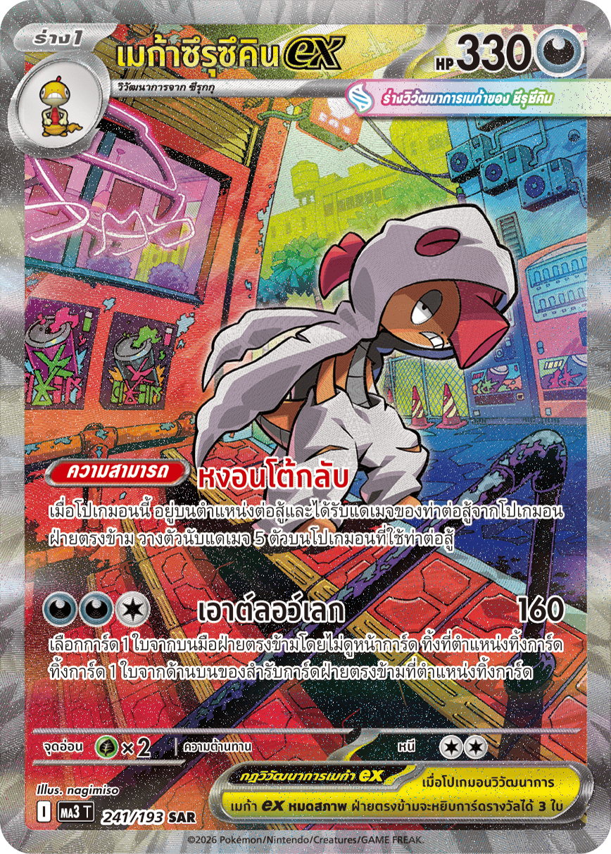 เมื่อโปเกมอนนี้ อยู่บนตำแหน่งต่อสู้และได้รับแดเมจของท่าต่อสู้จากโปเกมอน ฝ่ายตรงข้าม วางตัวนับแดเมจ 5 ตัวบนโปเกมอนที่ใช้ท่าต่อสู้