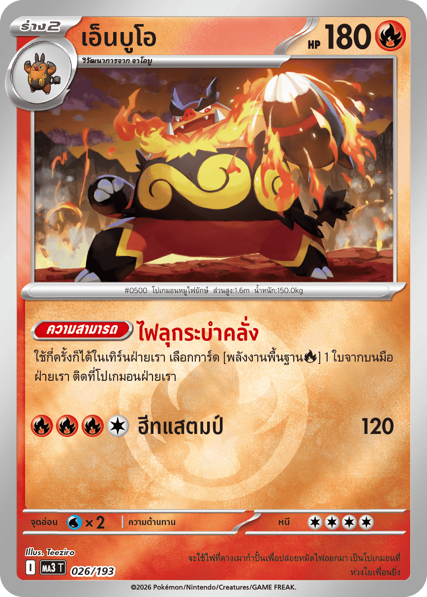 ใช้กี่ครั้งก็ได้ในเทิร์นฝ่ายเรา เลือกการ์ด [พลังงานพื้นฐาน[ไฟ]] 1 ใบจากบนมือ ฝ่ายเรา ติดที่โปเกมอนฝ่ายเรา