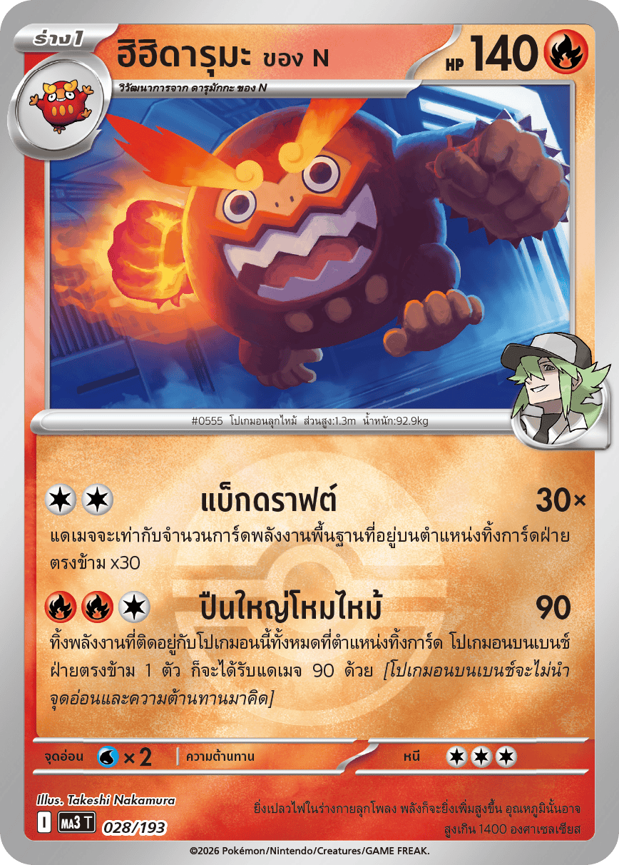 ทิ้งพลังงานที่ติดอยู่กับโปเกมอนนี้ทั้งหมดที่ตำแหน่งทิ้งการ์ด โปเกมอนบนเบนช์ ฝ่ายตรงข้าม 1 ตัว ก็จะได้รับแดเมจ 90 ด้วย {โปเกมอนบนเบนช์จะไม่นำ จุดอ่อนและความต้านทานมาคิด}