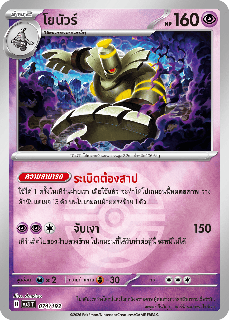 ใช้ได้ 1 ครั้งในเทิร์นฝ่ายเรา เมื่อใช้แล้ว จะทำให้โปเกมอนนี้[หมดสภาพ] วางตัว นับแดเมจ 13 ตัว บนโปเกมอนฝ่ายตรงข้าม 1 ตัว