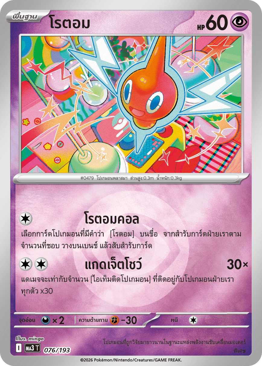 เลือกการ์ดโปเกมอนที่มีคำว่า [โรตอม] บนชื่อ จากสำรับการ์ดฝ่ายเราตาม จำนวนที่ชอบ วางบนเบนช์ แล้วสับสำรับการ์ด