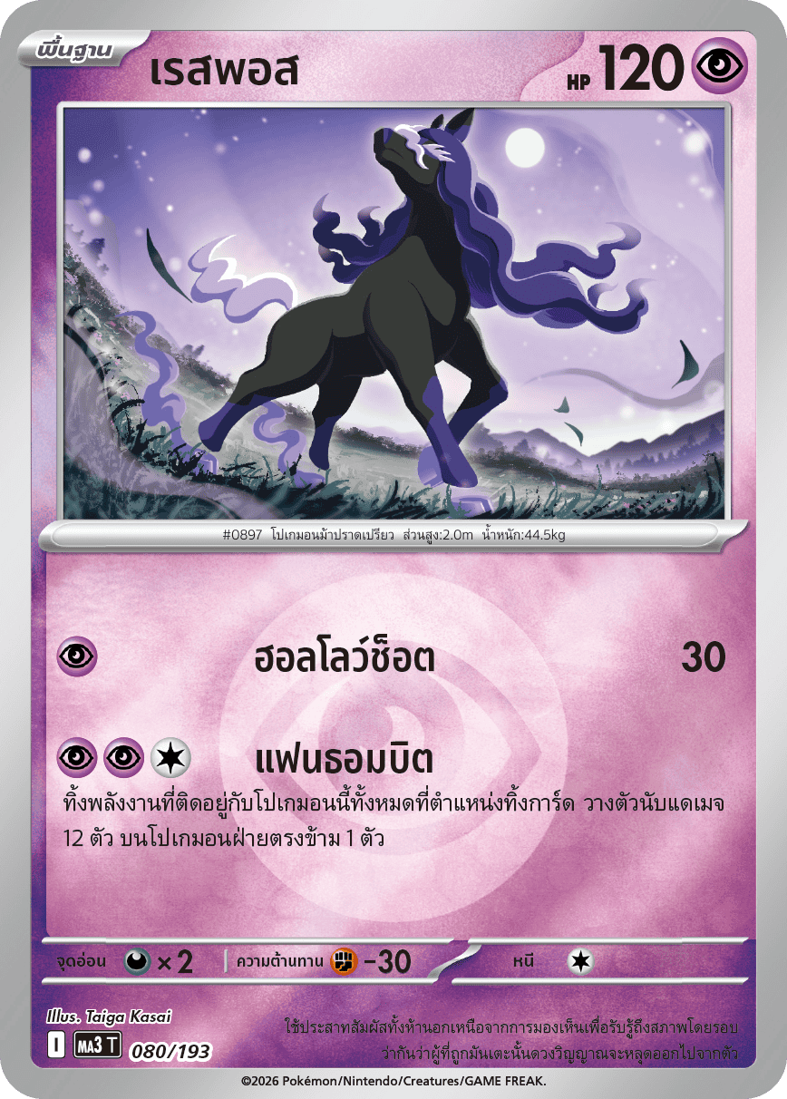 ทิ้งพลังงานที่ติดอยู่กับโปเกมอนนี้ทั้งหมดที่ตำแหน่งทิ้งการ์ด วางตัวนับแดเมจ 12 ตัว บนโปเกมอนฝ่ายตรงข้าม 1 ตัว