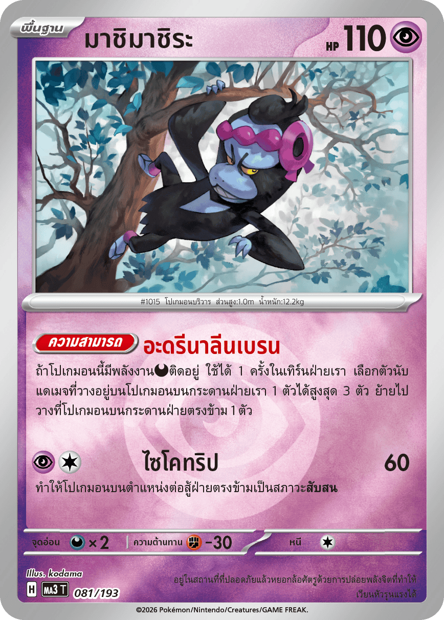 ถ้าโปเกมอนนี้มีพลังงาน[ความมืด]ติดอยู่ ใช้ได้ 1 ครั้งในเทิร์นฝ่ายเรา เลือกตัวนับ แดเมจที่วางอยู่บนโปเกมอนบนกระดานฝ่ายเรา 1 ตัวได้สูงสุด 3 ตัว ย้ายไป วางที่โปเกมอนบนกระดานฝ่ายตรงข้าม 1 ตัว