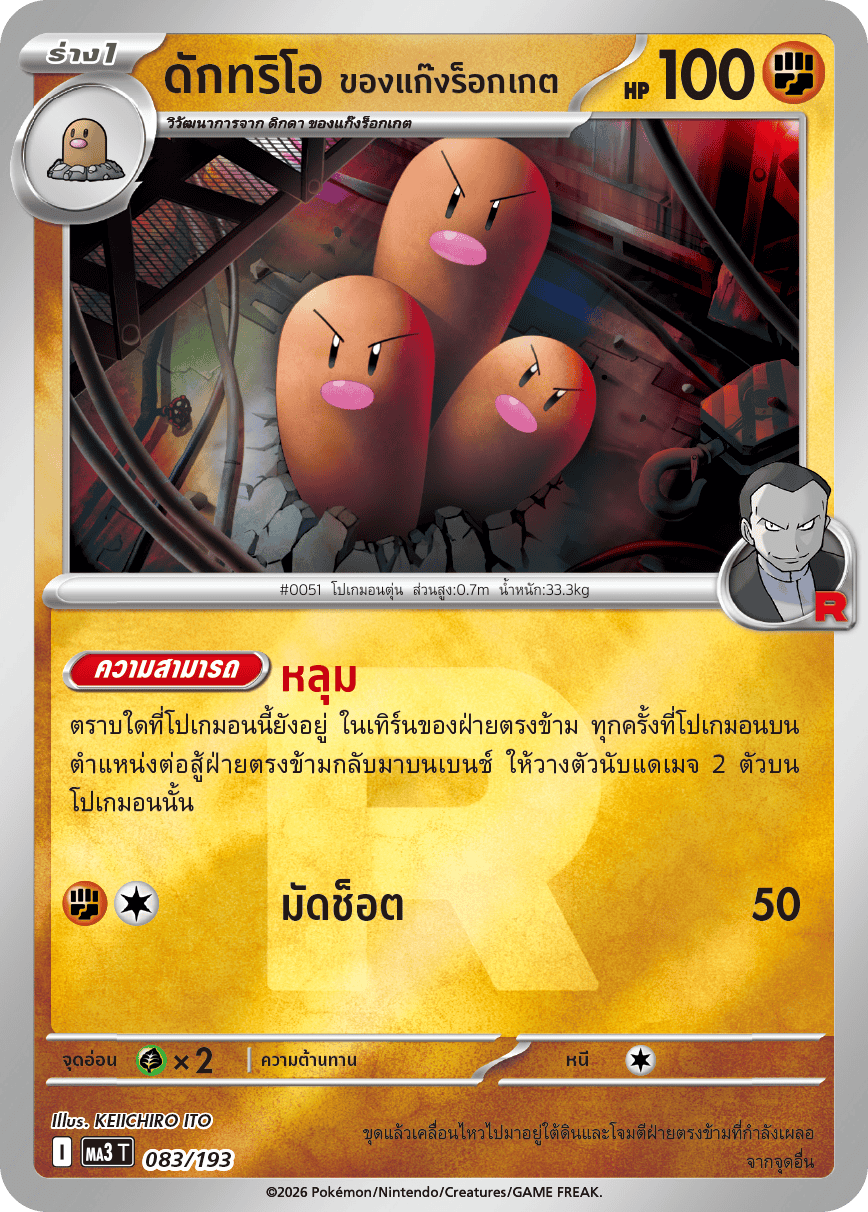 ตราบใดที่โปเกมอนนี้ยังอยู่ ในเทิร์นของฝ่ายตรงข้าม ทุกครั้งที่โปเกมอนบน ตำแหน่งต่อสู้ฝ่ายตรงข้ามกลับมาบนเบนช์ ให้วางตัวนับแดเมจ 2 ตัวบน โปเกมอนนั้น