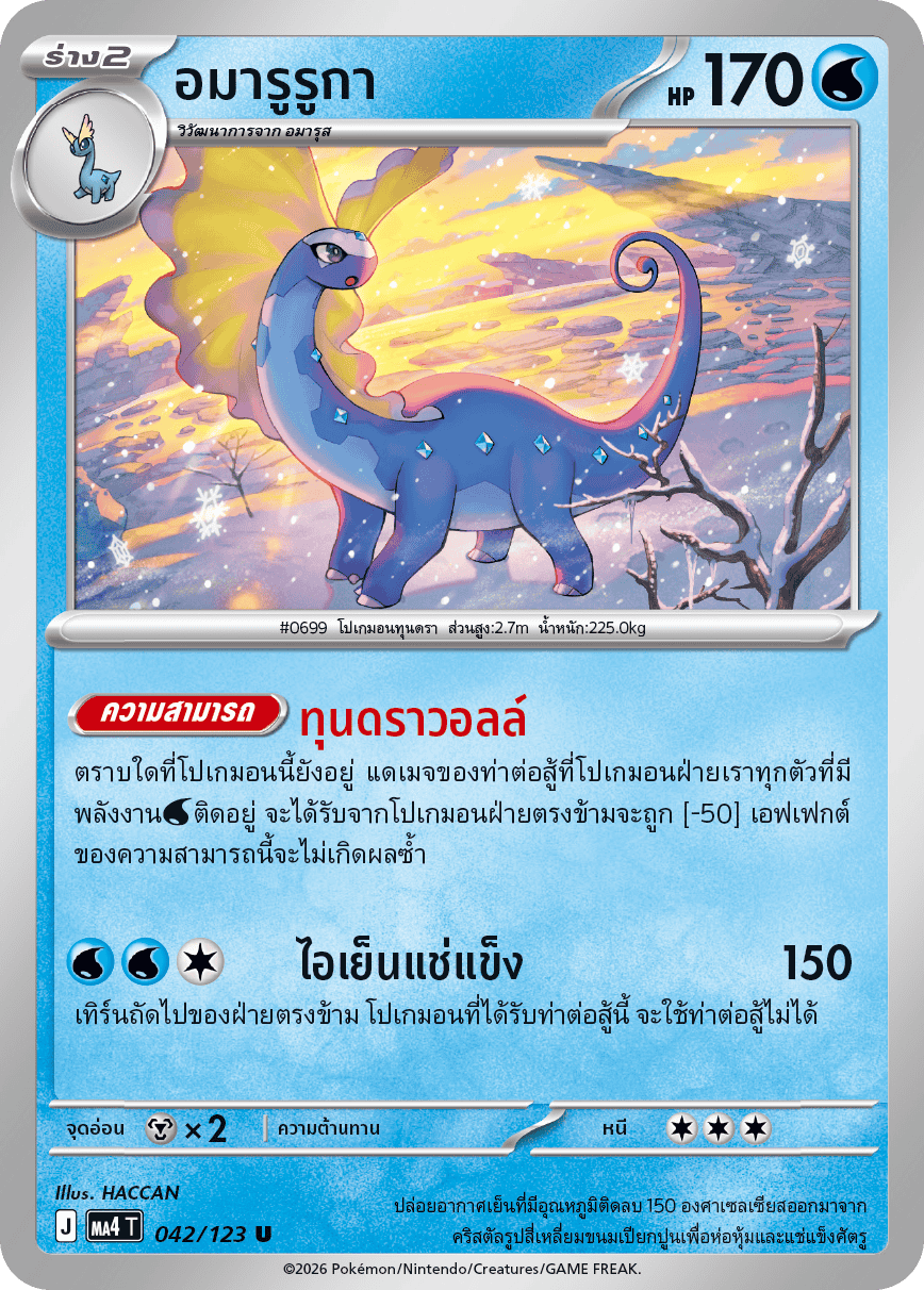 ตราบใดที่โปเกมอนนี้ยังอยู่ แดเมจของท่าต่อสู้ที่โปเกมอนฝ่ายเราทุกตัวที่มี พลังงาน[น้ำ]ติดอยู่ จะได้รับจากโปเกมอนฝ่ายตรงข้ามจะถูก [-50] เอฟเฟกต์ ของความสามารถนี้จะไม่เกิดผลซ้ำ