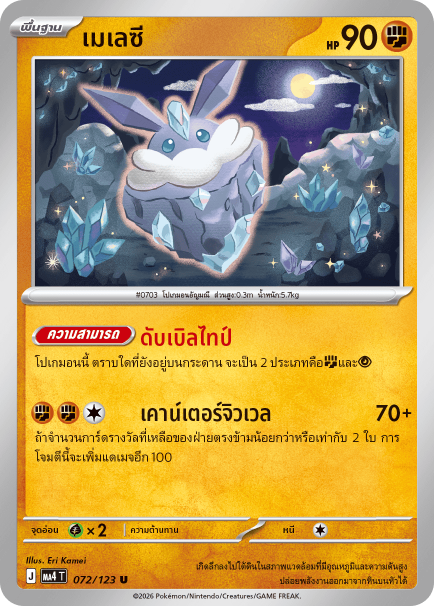 โปเกมอนนี้ ตราบใดที่ยังอยู่บนกระดาน จะเป็น 2 ประเภทคือ[ต่อสู้]และ[พลังจิต]