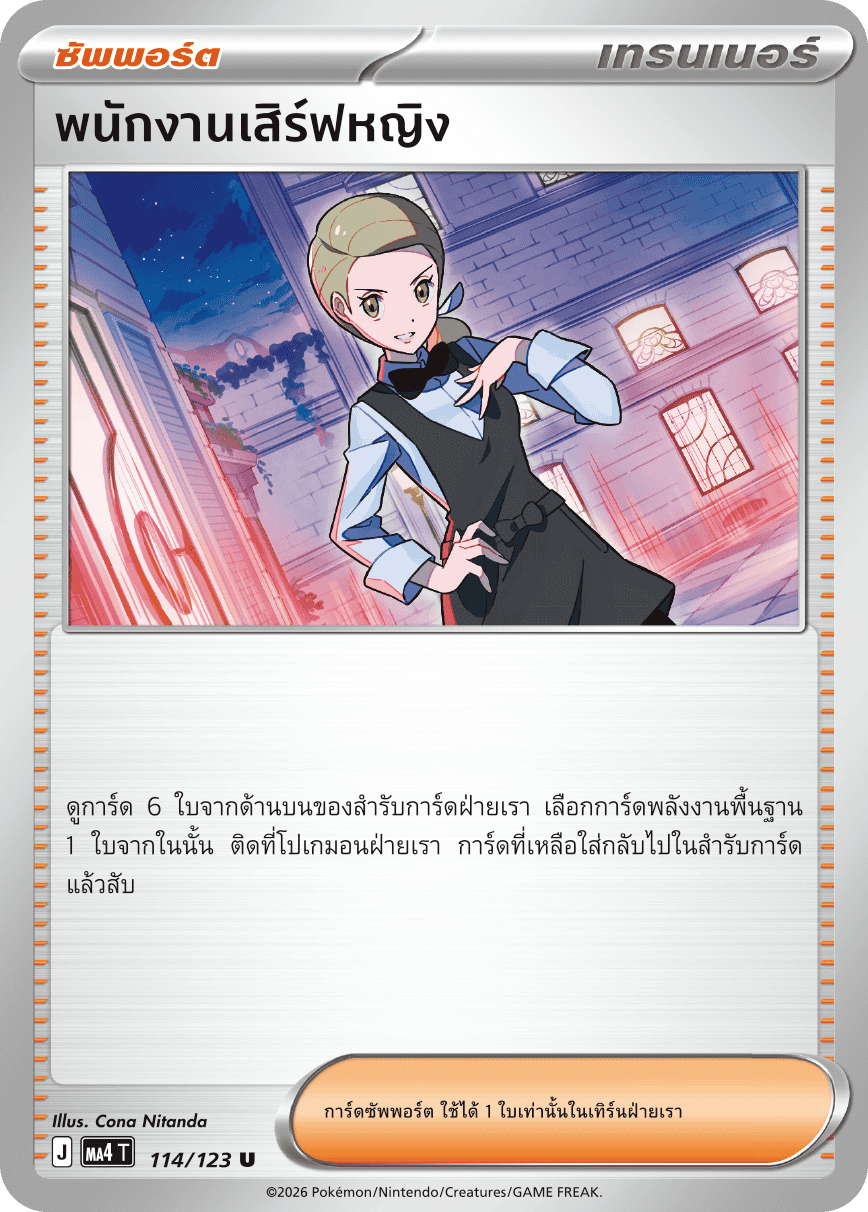 ดูการ์ด 6 ใบจากด้านบนของสำรับการ์ดฝ่ายเรา เลือกการ์ดพลังงานพื้นฐาน 1 ใบจากในนั้น ติดที่โปเกมอนฝ่ายเรา การ์ดที่เหลือใส่กลับไปในสำรับการ์ด แล้วสับ