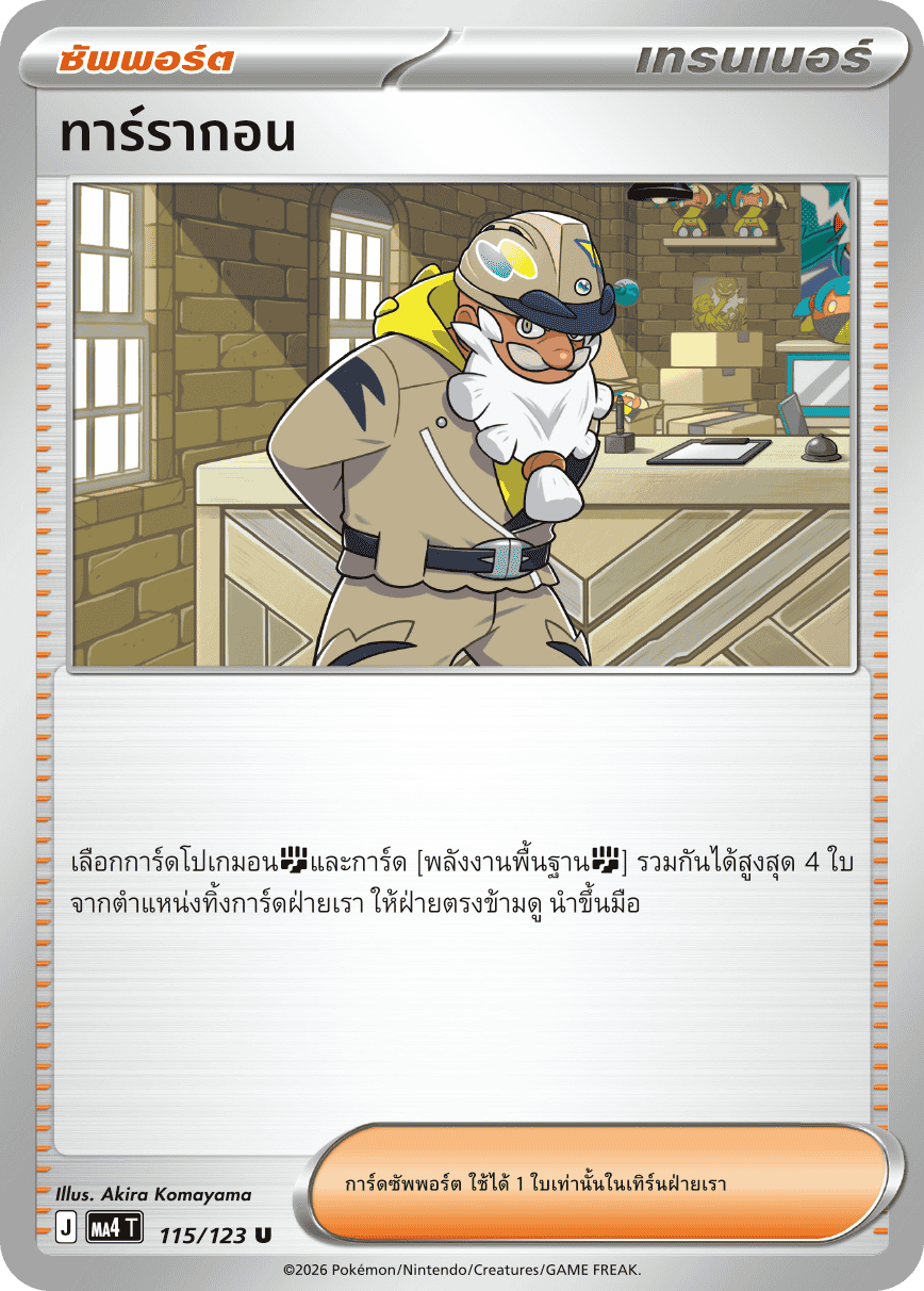 เลือกการ์ดโปเกมอน[ต่อสู้]และการ์ด [พลังงานพื้นฐาน[ต่อสู้]] รวมกันได้สูงสุด 4 ใบ จากตำแหน่งทิ้งการ์ดฝ่ายเรา ให้ฝ่ายตรงข้ามดู นำขึ้นมือ