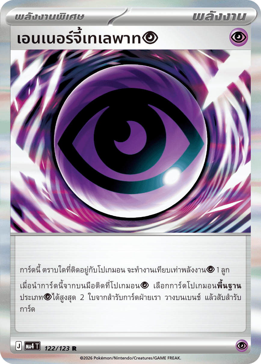 การ์ดนี้ ตราบใดที่ติดอยู่กับโปเกมอน จะทำงานเทียบเท่าพลังงาน[พลังจิต] 1 ลูก เมื่อนำการ์ดนี้จากบนมือติดที่โปเกมอน[พลังจิต] เลือกการ์ดโปเกมอน[พื้นฐาน] ประเภท[พลังจิต]ได้สูงสุด 2 ใบจากสำรับการ์ดฝ่ายเรา วางบนเบนช์ แล้วสับสำรับ การ์ด