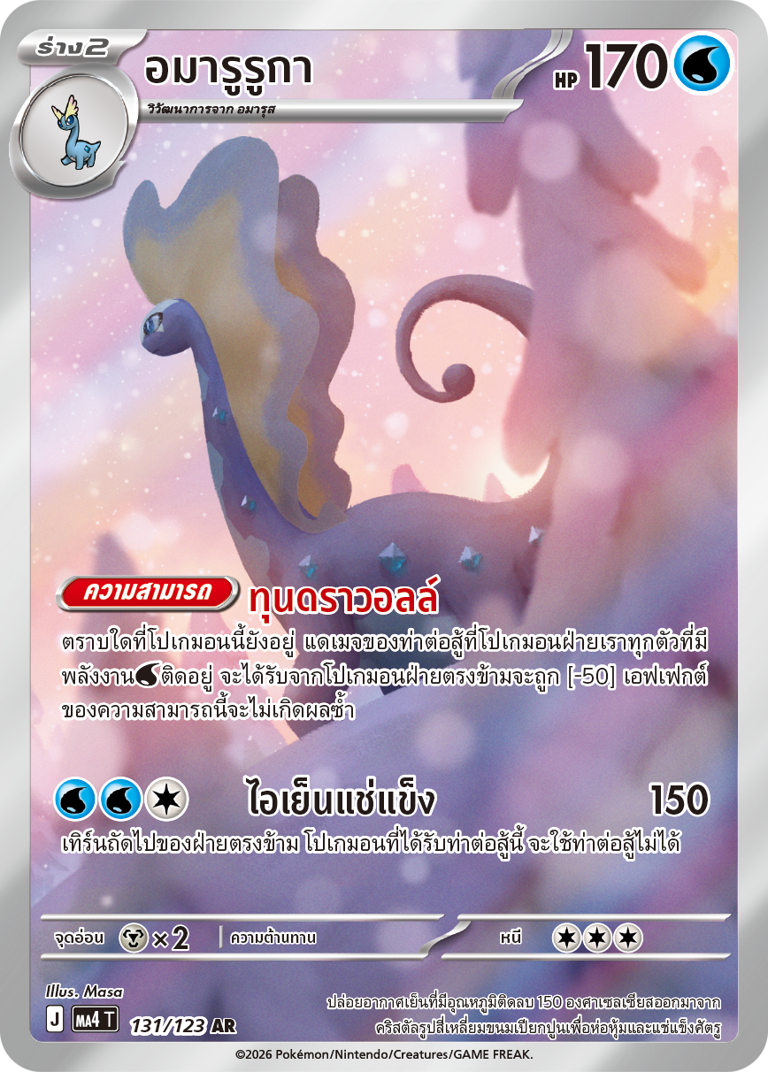 ตราบใดที่โปเกมอนนี้ยังอยู่ แดเมจของท่าต่อสู้ที่โปเกมอนฝ่ายเราทุกตัวที่มี พลังงาน[น้ำ]ติดอยู่ จะได้รับจากโปเกมอนฝ่ายตรงข้ามจะถูก [-50] เอฟเฟกต์ ของความสามารถนี้จะไม่เกิดผลซ้ำ
