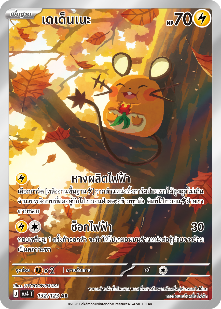 เลือกการ์ด [พลังงานพื้นฐาน[สายฟ้า]] จากตำแหน่งทิ้งการ์ดฝ่ายเรา ได้สูงสุดไม่เกิน จำนวนพลังงานที่ติดอยู่กับโปเกมอนฝ่ายตรงข้ามทุกตัว ติดที่โปเกมอน[สายฟ้า]ฝ่ายเรา ตามชอบ