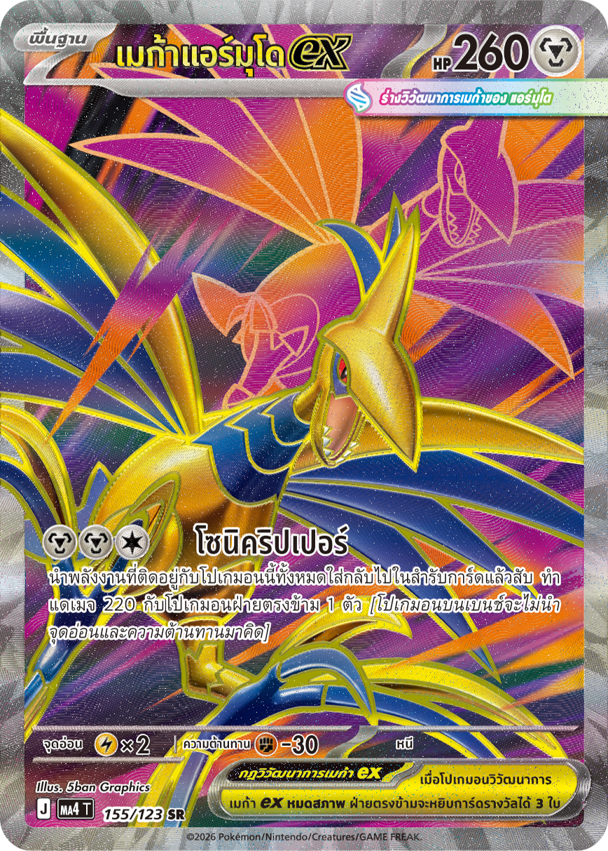 นำพลังงานที่ติดอยู่กับโปเกมอนนี้ทั้งหมดใส่กลับไปในสำรับการ์ดแล้วสับ ทำ แดเมจ 220 กับโปเกมอนฝ่ายตรงข้าม 1 ตัว {โปเกมอนบนเบนช์จะไม่นำ จุดอ่อนและความต้านทานมาคิด}